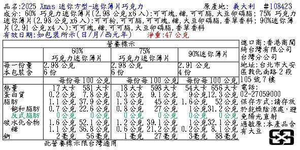 60% 巧克力迷你薄片(2.98公克x6入):可可塊,糖,可可脂,大豆卵磷脂; 75% 巧克力迷你薄片(2.98公克x6入):可可粉,可可脂,可可塊,糖,大豆卵磷脂,香草香料; 90%迷你薄片(2.91公克x4入):可可塊,糖,可可脂,大豆卵磷脂,香草香料 SKU:1620002142