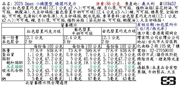 紅色彗星巧克力球(12.1公克x2入):可可塊,糖,杏仁漿,可可脂, 植物油脂(葵花籽油,可可脂, 橄欖油),大豆卵磷脂;藍色彗星牛奶可可球(12.4公克x3入):糖,可可脂,榛果漿,全脂奶粉,可可塊,乳清粉(牛奶來源),大豆卵磷脂,脫水乳脂,香草香料;金色彗星巧克力球(12.1公克x2入):可可塊,糖,杏仁漿,可可脂,植物油脂 (葵花籽油,可可脂,橄欖油),大豆卵磷脂。SKU:1620002139