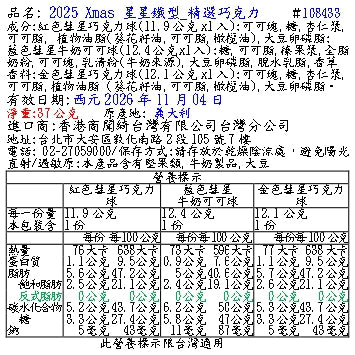 紅色彗星巧克力球(11.9公克x1入):可可塊,糖,杏仁漿,可可脂, 植物油脂(葵花籽油,可可脂,橄欖油),大豆卵磷脂;藍色彗星牛奶可可球(12.4公克x1入):糖,可可脂,榛果漿,全脂奶粉,可可塊,乳清粉(牛奶來源),大豆卵磷脂,脫水乳脂,香草香料;金色彗星巧克力球(12.1公克x1入):可可塊,糖,杏仁漿,可可脂,植物油脂 (葵花籽油,可可脂,橄欖油),大豆卵磷脂。SKU:1620002138