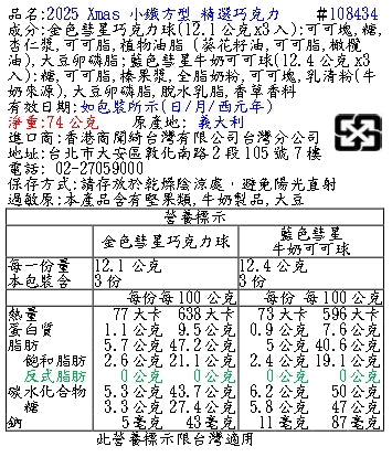 金色彗星巧克力球(12.1公克x3入):可可塊,糖,杏仁漿,可可脂,植物油脂 (葵花籽油,可可脂,橄欖油),大豆卵磷脂;藍色彗星牛奶可可球(12.4公克x3入):糖,可可脂,榛果漿,全脂奶粉,可可塊,乳清粉(牛奶來源),大豆卵磷脂,脫水乳脂,香草香料SKU:1620002137