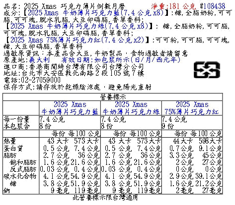 【2025 Xmas 牛奶薄片巧克力藍(7.4公克x8)】:糖,全脂奶粉,可可脂,可可塊,脫水乳脂,大豆卵磷脂,香草香料;【2025 Xmas 牛奶薄片巧克力綠(7.4公克x8)】: 糖,全脂奶粉,可可脂,可可塊,脫水乳脂,大豆卵磷脂,香草香料;【2025 Xmas 75%薄片巧克力紅(7.4公克x2)】:可可粉,可可脂,可可塊,糖,大豆卵磷脂,香草香料 SKU:1620002101