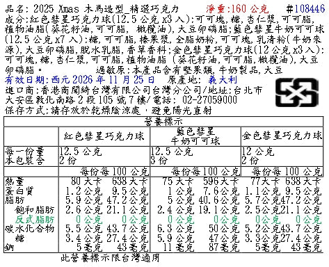 紅色彗星巧克力球(12.5公克x3入):可可塊,糖,杏仁漿,可可脂, 植物油脂(葵花籽油,可可脂, 橄欖油),大豆卵磷脂;藍色彗星牛奶可可球(12.5公克x7入):糖,可可脂,榛果漿,全脂奶粉,可可塊,乳清粉(牛奶來源),大豆卵磷脂,脫水乳脂,香草香料;金色彗星巧克力球(12公克x3入):可可塊,糖,杏仁漿,可可脂,植物油脂 (葵花籽油,可可脂,橄欖油),大豆卵磷脂。SKU:1620002105