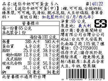 本產品含有大豆、牛奶、堅果類