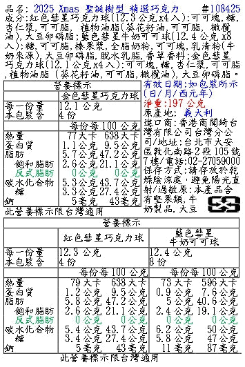 紅色彗星巧克力球(12.3公克x4入):可可塊,糖,杏仁漿,可可脂, 植物油脂(葵花籽油,可可脂, 橄欖油),大豆卵磷脂;藍色彗星牛奶可可球(12.4公克x8入):糖,可可脂,榛果漿,全脂奶粉,可可塊,乳清粉(牛奶來源),大豆卵磷脂,脫水乳脂,香草香料;金色彗星巧克力球(12.1公克x4入):可可塊,糖,杏仁漿,可可脂,植物油脂 (葵花籽油,可可脂,橄欖油),大豆卵磷脂。SKU:1620002158